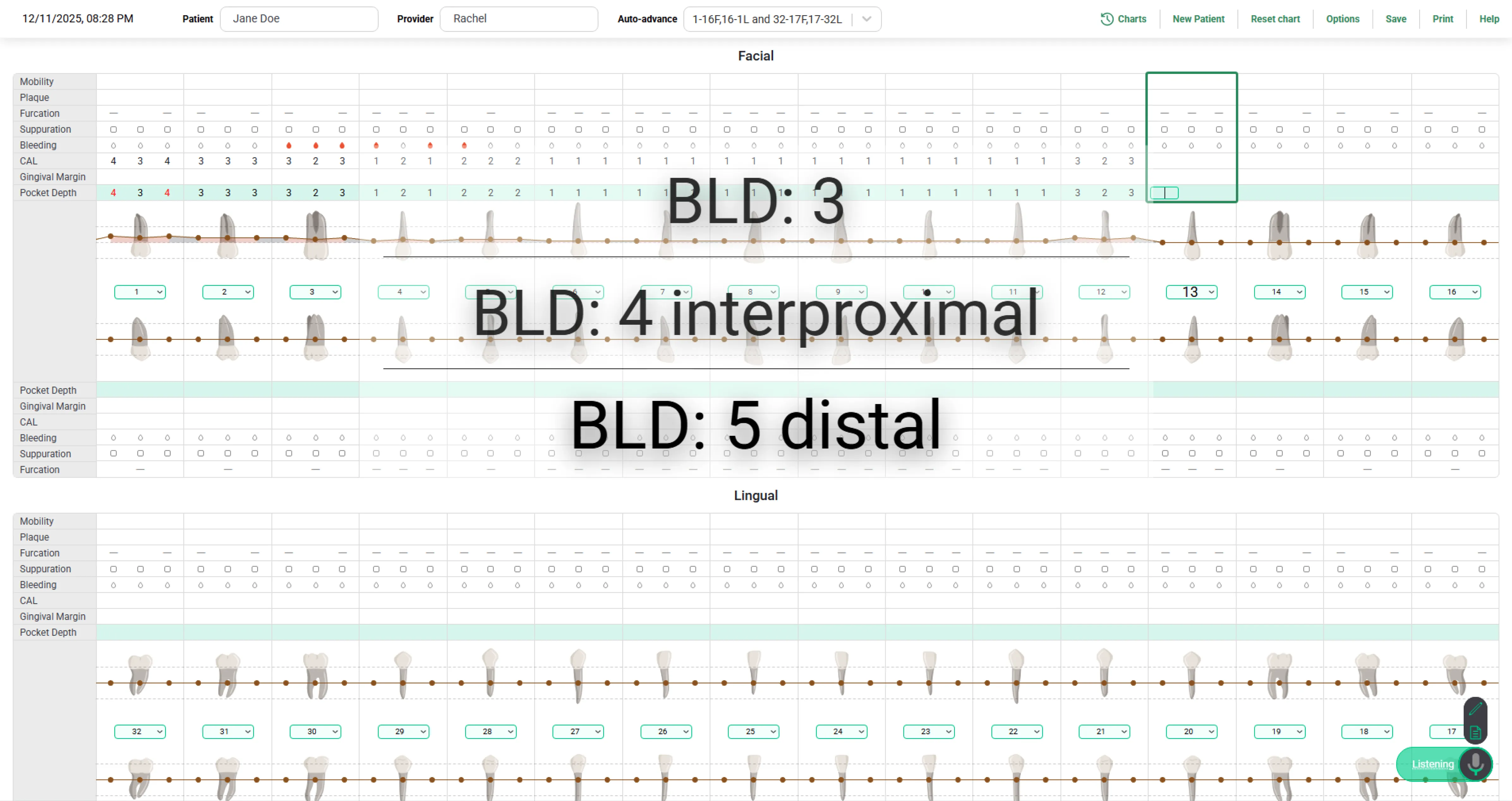 AI-driven software for an assistant-free, voice-enabled periodontal charting in five minutes with patient education tools.