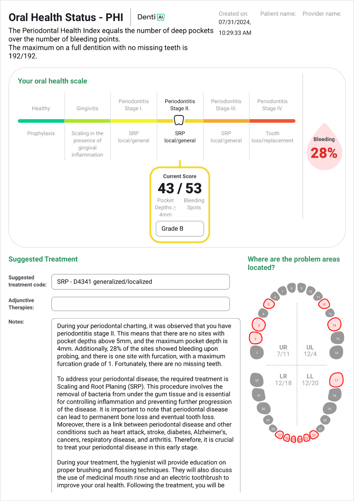 Each charting session generates a calibrated patient-facing Periodontal Health Index (PHI) report, staging and grading their disease status per the 2017 AAP guidelines. Concurrently, leaders gain oversight through management dashboards that track utilization, audit findings, and treatment behaviors across providers.