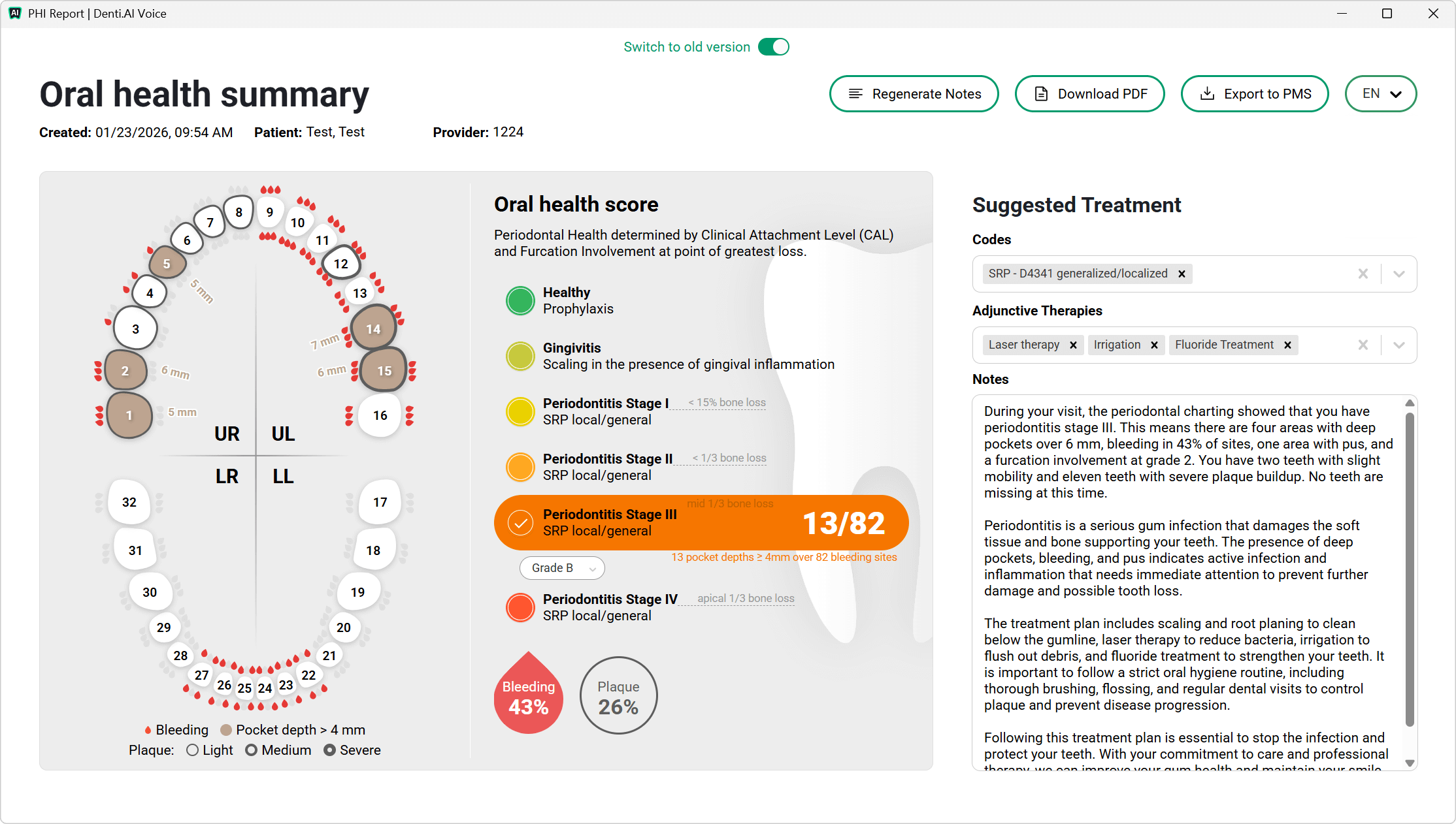 A PHI report is an AI-generated oral health summary designed specifically for patient education. Instead of presenting raw clinical numbers, it organizes periodontal and diagnostic data into a clear, patient-friendly format.